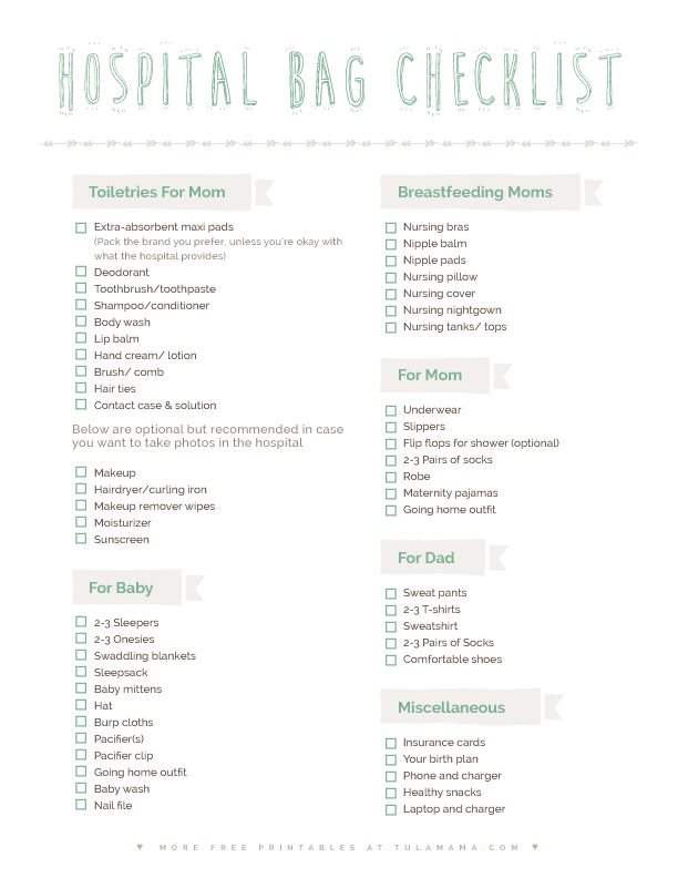 Here are two additional free printable hospital bag checklists. To print, please be sure to set your printer to Portrait.